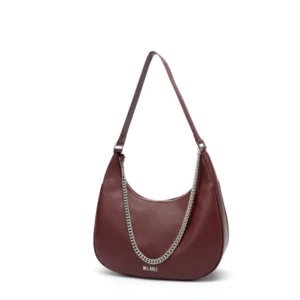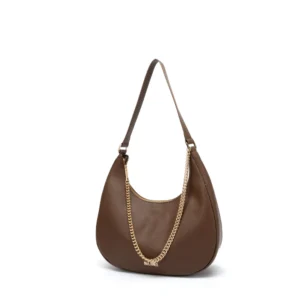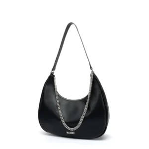 It is a modern, crescent shaped bag featuring a single, short top handle and a decorative chain detail.
